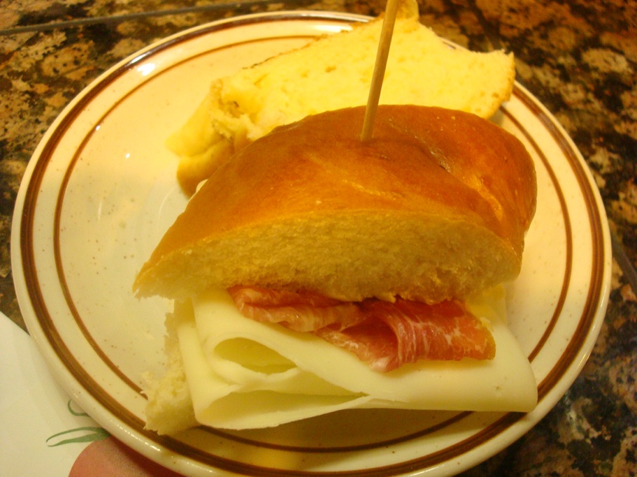 Traditional Pebete Sandwich consists of: Buttered Argentinian bread, any choice of cheese or meat (in this case provolone and proscuitto)