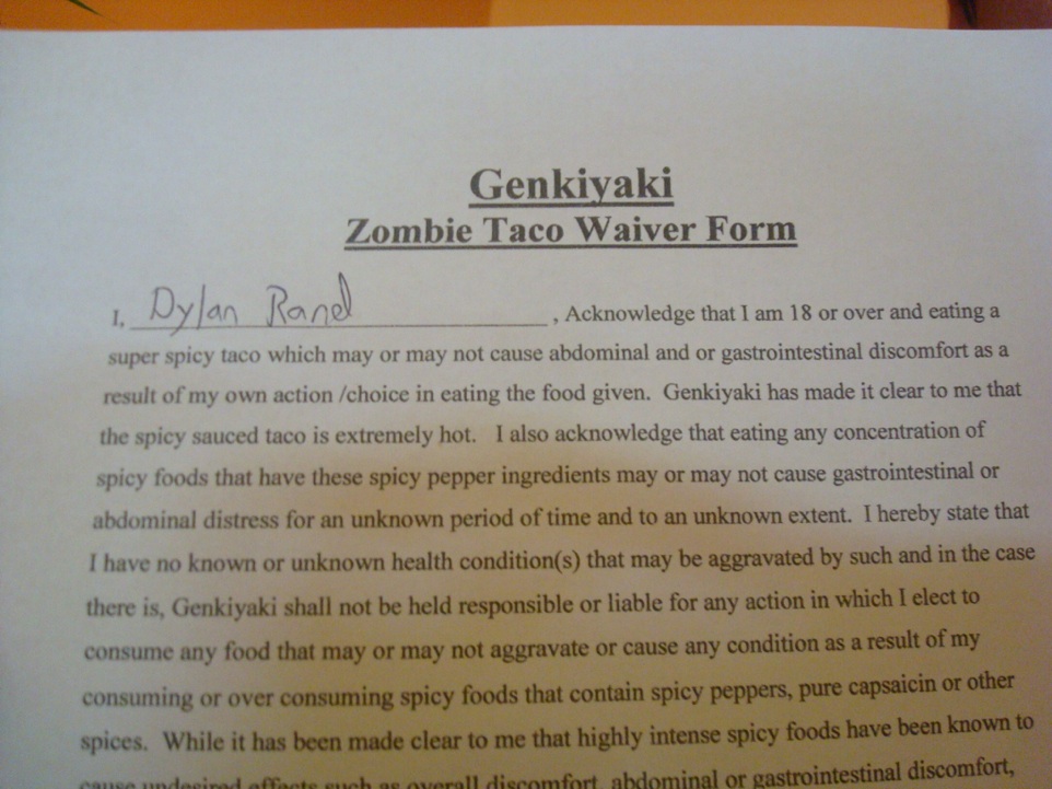 However I had to leave due to an early work schedule the next day and according to David (owner/chef of Genkiyaki; Along with a few other witnesses according to sources) who were hopeful for Dylan, he kept his word and finished the fifth one. According to the rules he cannot drink anything for fifteen minutes after consuming one Z.T. (in this case it was five), for him to be on the wall. After a little past the 15 minute mark when David announced him accomplishing the goal, Dylan unwillingly turned into a zombie (or at least became a vessel that housed an eruption waiting to happen like Mt. Eyjafjallajokull).
