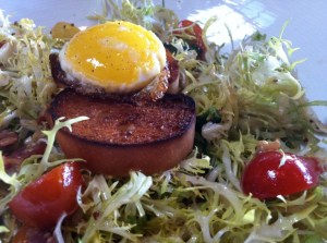 Warm Frisee Salad contains: Bacon Vinaigrette, Cherry Tomatoes, Crouton and Fried Egg Yolk (Sea Salt, Berkeley, CA)