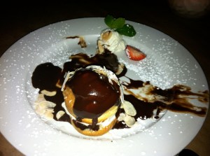 The chicken was soft and flavorful from the outside given the coating of the Red Wine sauce. While I got closer towards the core of the chicken and the mashed potatoes it became a lot more dry. I’m all for natural juices that soak in the flavor rather than superficial dousing of it. For dessert, mother of cream puffs… The profiteroles served as the perfect ending to this somewhat heavy dinner. They whip was light, the puff pastry was airy and the chocolate wasn’t too overwhelming although the presentation needed a bit of refinement.