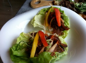 Samgyeopsal Ssam (aka Korean tacos of savory pork and pickled vegetables, wrapped in a lettuce shell)