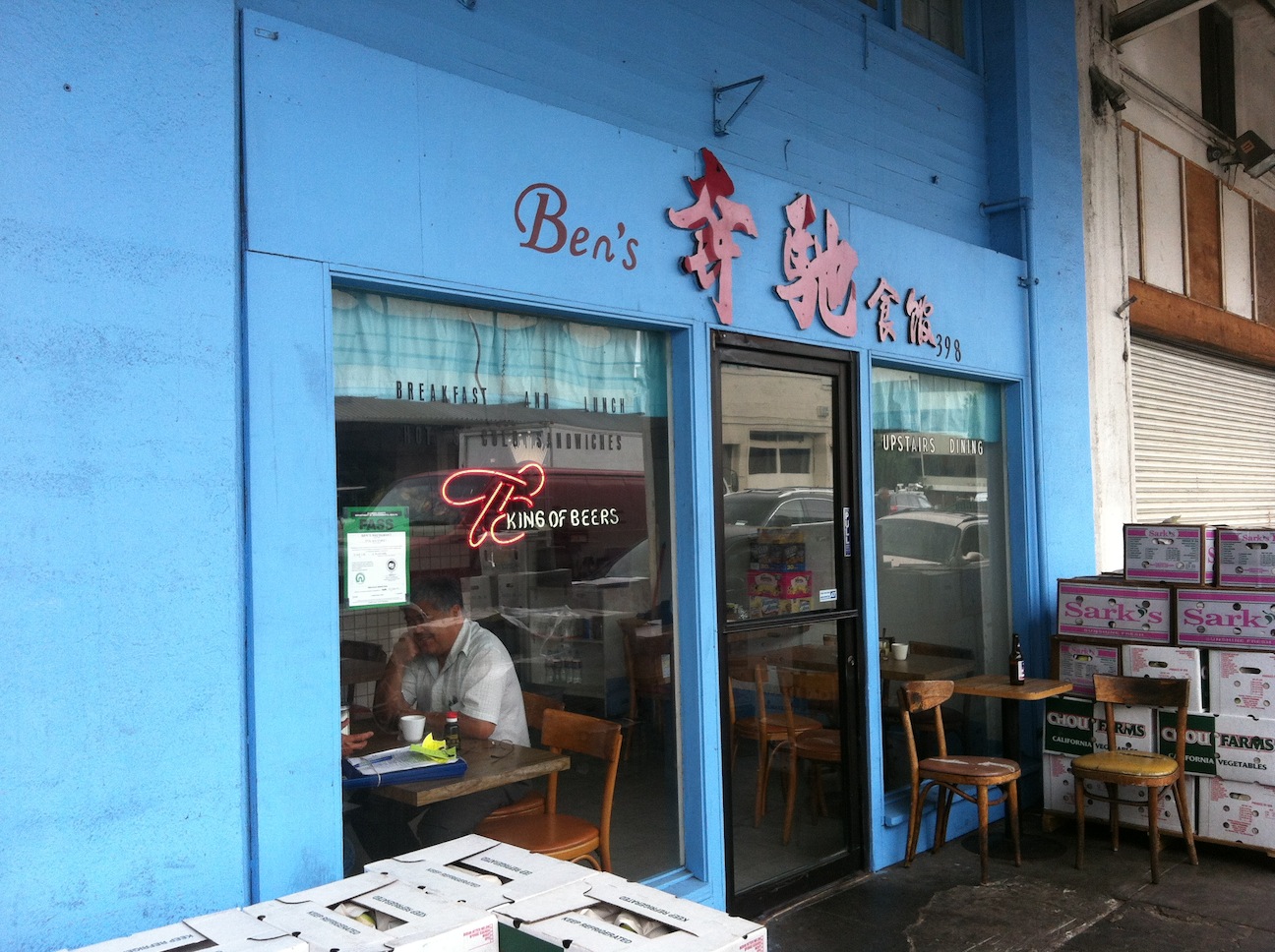 For a restaurant tucked away amidst the many abandoned corners of Jack London’s Waterfront the corner is surprisingly full of color, a dilapidated hue of royal blue may suggest otherwise. The interior is cramped to the max. Slightly bigger than my Grandparent’s old victorian apartment. Limited tables and rickety chairs as if they were furnished from the Qin Dynasty. The great tile kitchen wall (like China’s Great Wall) addresses a bold statement that no one besides the restaurant personnel should peek over its borders freely. An elder Chinese Man (the owner Ben, conveniently enough), only dropped a few lines of Cantonese to the elder Chinese woman who accompanied him before picking up his knife, prepping another dish and firing it up in the wok.