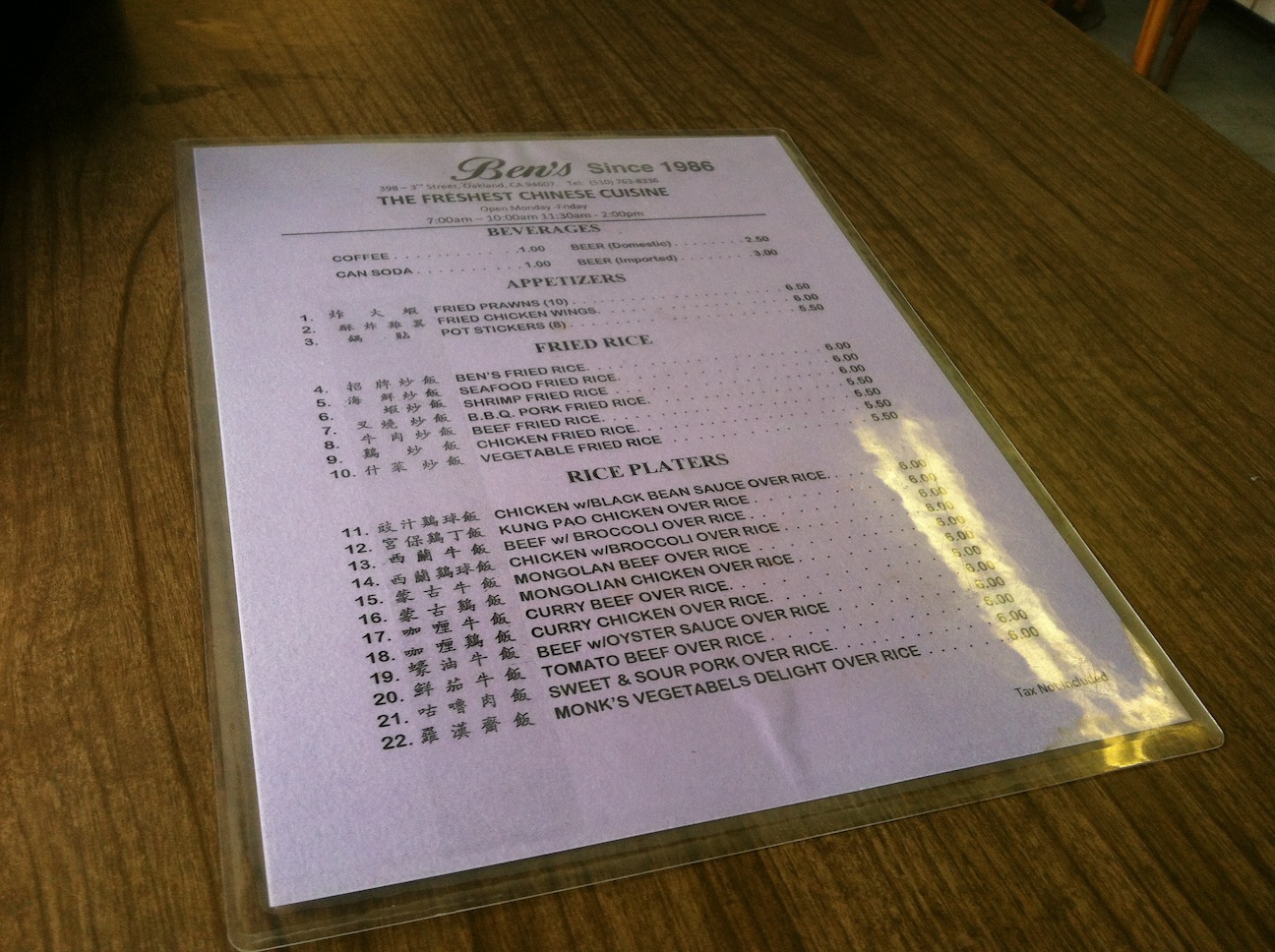 Overall the experience costed us $15.00 (with tax included).I didn’t hesitate to throw down $5.00 tip, making the total cost to $20.00. Unanimously, the intern and I decided for the price, portion, presentation and pristine flavors this restaurant is worthy of the cliche title “hidden gem.” I wasn’t really sold on all the hype Yelpers gave this place but now I am definitely a part of that tiny pack of supporters. Certainly like most old-fashioned places they don’t accept card (and I am advocator of multiple forms of payment), just more convenient that way. I can’t really knock them down for it since many of the old generation have that mentality when it comes to finances. Ben’s has stood the test of time and provided a clear testament to many potential entrepreneurs (and restauranteurs) who want to be a part of Oakland’s renaissance of artisanal and cultural offerings. No matter what you’re offering, as long as you keep the customers happy and provide good food (and/or drink), then you’ll stay in business for one more day (or in this case one more year).