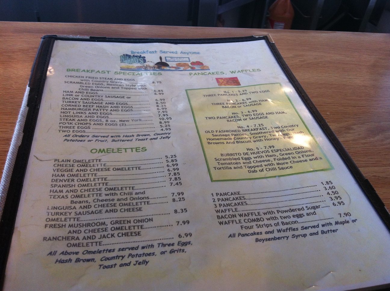 Shame on me, maybe giving props to this place wasn’t necessary after all? Nevertheless, I was intrigued because the exterior was the same charm from the place where it all began. Inspiring me to make the brand you all come to know and appreciate to this day, we stepped inside and sat right at the center front dining area. The waitress plopped the menus in front of us and gave us some time to think about our orders before returning. Everything listed in the menu was predictable, pedestrian and somewhat pedantic. The smorgasbord of items offered were listed in the most disorganized manner possible: Eggs, Chicken, Sandwiches, Entrees, Drinks, Fountain Drinks, Oatmeal (had its own special section, with just one listing) and more. The specials had literally six different isolated (and highlighted) boxes for you to fixate on: Weight Watcher’s, Luncheon, Biscuits and Gravy, Nikko’s Special Sandwiches, House Specialty, and House made Chili.