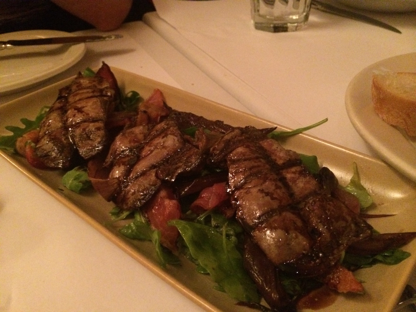Grilled Duck Liver, Arugula, Bacon and Balsamic Reduction