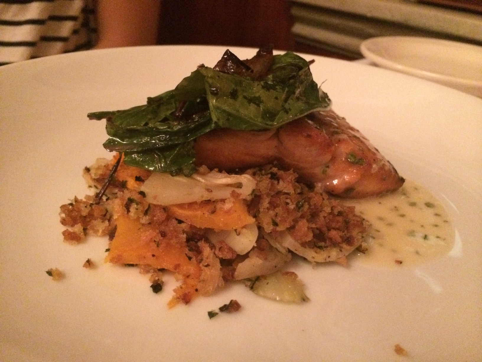 Coho Salmon w/ kabocha-fennel tian, dandelion greens and herbed beurre blanc sauce