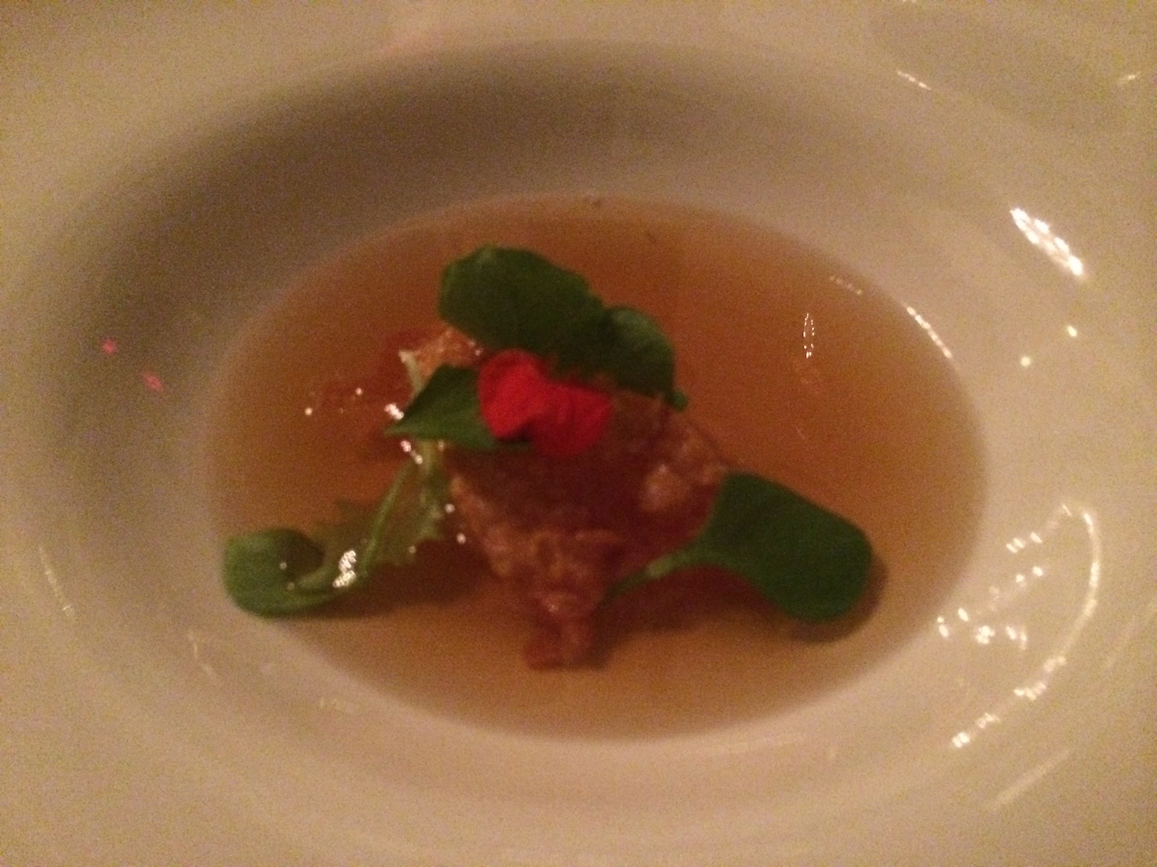 A jazzed up version of Chicken noodle soup (minus the noodle). Sous-vide egg yolk remained gelatinous in the consommé and the crispy skin added the savory and crunchy texture it needed to become a “sophisticated” soup. The lemon notes in the bread awakened as you continually dunk it within the consommé. Perhaps I was a bit distracted but the greens didn’t serve a purpose for me other than adding color for the dish. After the take away, we were then immediately introduced to our fourth dish of the tasting menu…