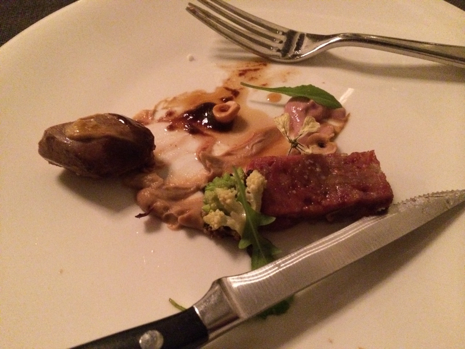 Sunchokes and I have this really awkward relationship, it’s sort of like that fling which almost resulted in a relationship but sort of became a F.W.B.s type of deal until you fall out of each other’s live and relapse all over again. My first experience with this ingredient was at Providence several years ago. The earthy puree rekindled those memories, any type of fungi reinforces the earthiness plus the texture of a hedgehogs wavy hair (not as spiky of course). The kale crisps gave a much needed crunch as it rests next to the perfectly cooked medium rare cuts of steak. Savory and earthy, a common combination with the presentation focused dead center. We finished our plates swiftly and it was only a matter of time until our third bread intermission and final dish came about. Great mother of god, what have I done? Nothing wrong in actuality, because at this point of the meal I was still very hungry. The food blogger in me was furious of course and yet all I have to show for it is 1/3rd of a plate and some pretzel bread. The dish itself was gamy, however I preferred the rilette (pate) version (next to the knife) over the actual protein. It retained more flavor and didn’t need much of the salt from the pretzel bread, which should have supplemented the entire dish. Hazelnuts provided texture but didn’t add substance to the dish as a whole.