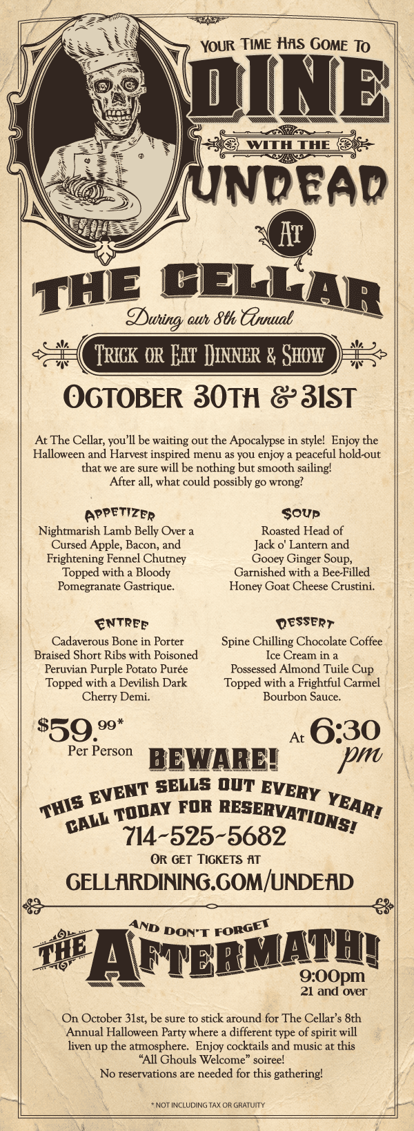 Tickets costs $59.00 per person and can be found at www.cellardining.com/undead. Following this event on Halloween night, The Cellar will also be hosting its 8th Annual Halloween Costume Party “The Aftermath” at 9pm and will be a 21 and over after party open to the public.