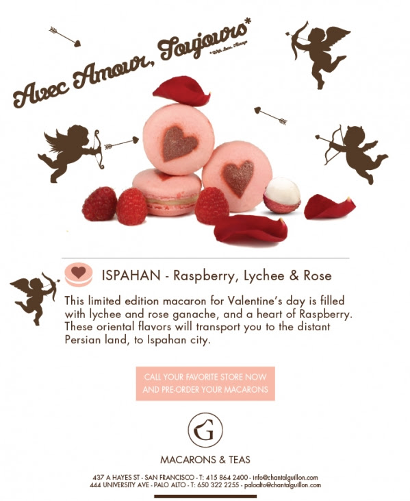 Just dropping by to inform everyone about Chantal Guillon’s limited edition Valentine’s Day flavor: Ispahan. This treat comes filled with lychee and rose ganache and is fitted with a raspberry heart. Get some now and treat your special someone to a sweet treat!